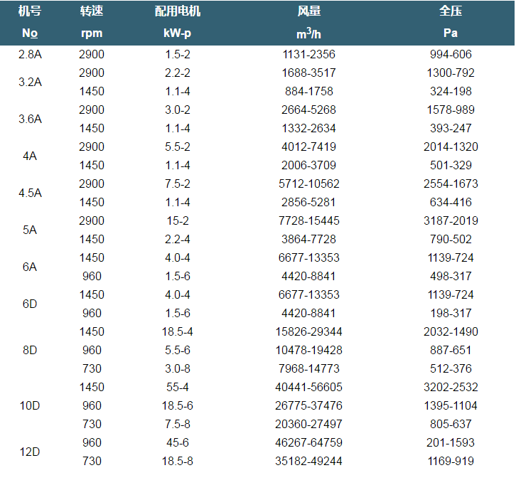 BF4-72型風(fēng)機(jī)的性能與選用件及地基尺寸與4-72型-致,可按其樣本選擇。該風(fēng)機(jī)機(jī)構(gòu)基本與4-72型相同,m.2.8-6采用B35型帶法蘭盤與地腳的電機(jī),0.6-12C、D電動(dòng)機(jī)選用表中與Y系列相對應(yīng)的YTB系列,安裝形式為B3。